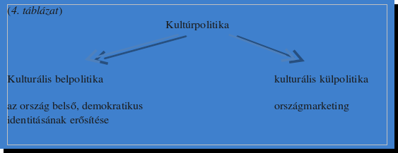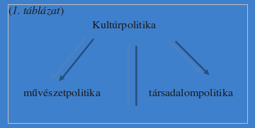 A kultúrpolitika két részből áll. Az egyik a művészetpolitika, a másik a társadalompoltika (1. táblázat)