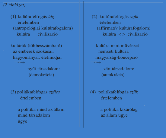 A magyarországi kultúrpolitika alapját az 1989 óta többnyire az etnikai alapon értelmezett nemzetfelfogás képezi, mintha a trianoni szerződés következményeként a szomszédos országok javára leválasztott területeken élö magyar kisebbség kulturálisan homogén, etnikailag egységes lenne, s ekként még mindig Magyarországhoz tartozna. Ez a megközelítés az ország határain belüli etnicizáló beszéd elterjedése mellett az ország határain kívülre irányuló „kulturális hegemonizálás” problémáját is felveti. A Magyarországon uralkodó kultúrafelfogás alapvetően zárt, statikus és affirmatív maradt a rendszerváltás után – a 2010-es választások óta pedig egyértelműen a zárt társadalom zárt kultúrafelfogása dominál.