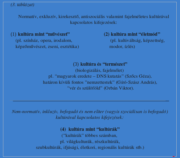 Az autonóm, önszerveződő kultúra fogalma köszönő viszonyban sincs a mai magyar kormány kultúrafelfogásával. Ezzel szemben néhány példát említünk a kultúra fogalmának nemzetközileg ismert, lehetséges megközelítéseire: