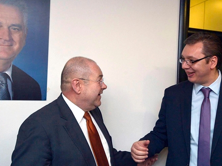 A fényképen baloldalon Pásztor István, a VMSZ elnöke látható Aleksandar Vučić szerb kormányfő társaságában (a háttérben képen Tomislav Nikolić szerb elnök). A fénykép forrása: http://static.rtv.rs/slike/2014/04/07/aleksandar-vucic-istvan-pastor_660x330.jpg