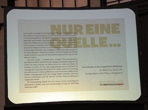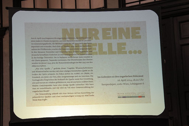 A VWI 2014. április 16-i emlékkonferenciája e tragédiára emlékezett [2]. A különböző diszciplínák területéről érkezett kutatók egy-egy fontos, beszédes, jellemző vagy éppen egyedülálló forráson keresztül elevenítették fel az áldozatok szenvedéseit. Egy szöveg-, interjú- vagy jegyzőkönyvrészlet, egy fénykép vagy egy film, egy megőrzött tárgy állt a középpontban. Az előadók saját tudományterületük módszereivel mutatták be és elemezték ezeket a forrásokat: kiktől származnak, hogyan keletkeztek, miképp maradtak fenn máig, s mit üzennek az utókornak. Hogyan veszi ma őket szemügyre a kutató és miképp tudja beilleszteni a magyar soá összképébe? Milyen új szempontokat vethet fel egyetlen forrás?