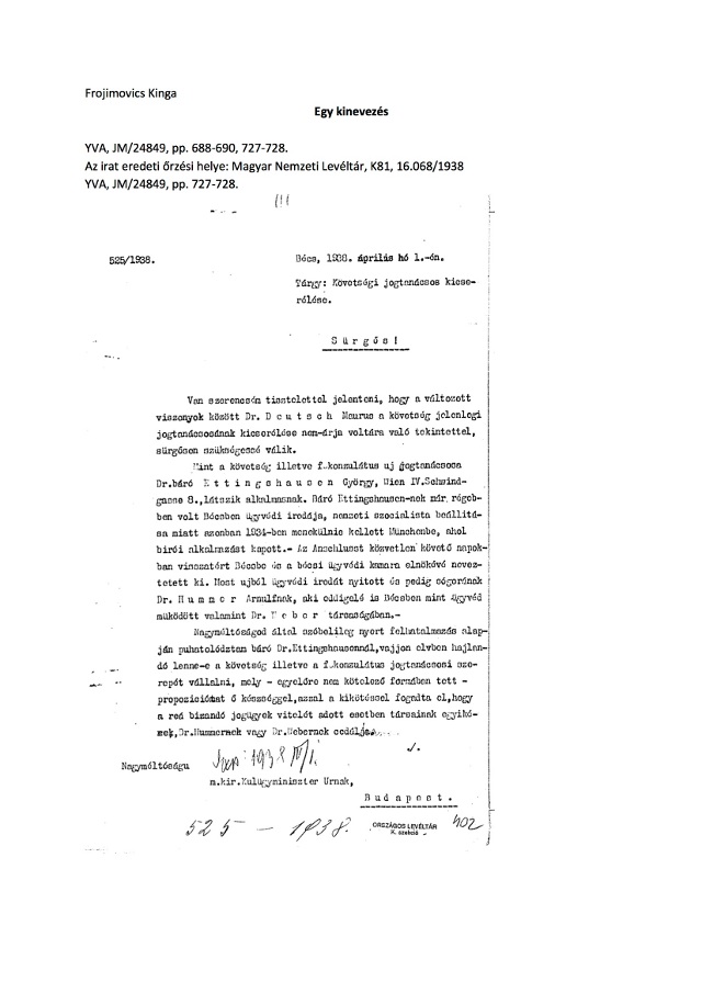 Minthogy kívánatosnak látszik, hogy a magyar követség illetve főkonzulátus jogtanácsosa olyan személyiség legyen, aki a N.S.D.A.P.-nél is súllyal bír – báró Ettingshausen jelentős S.A. funkcionárius – tisztelettel felkérem nagyméltóságodat, hogy engem a szokásos meghatalmazás megkötésére felhatalmazni méltóztassék.