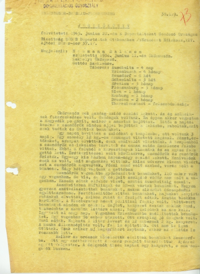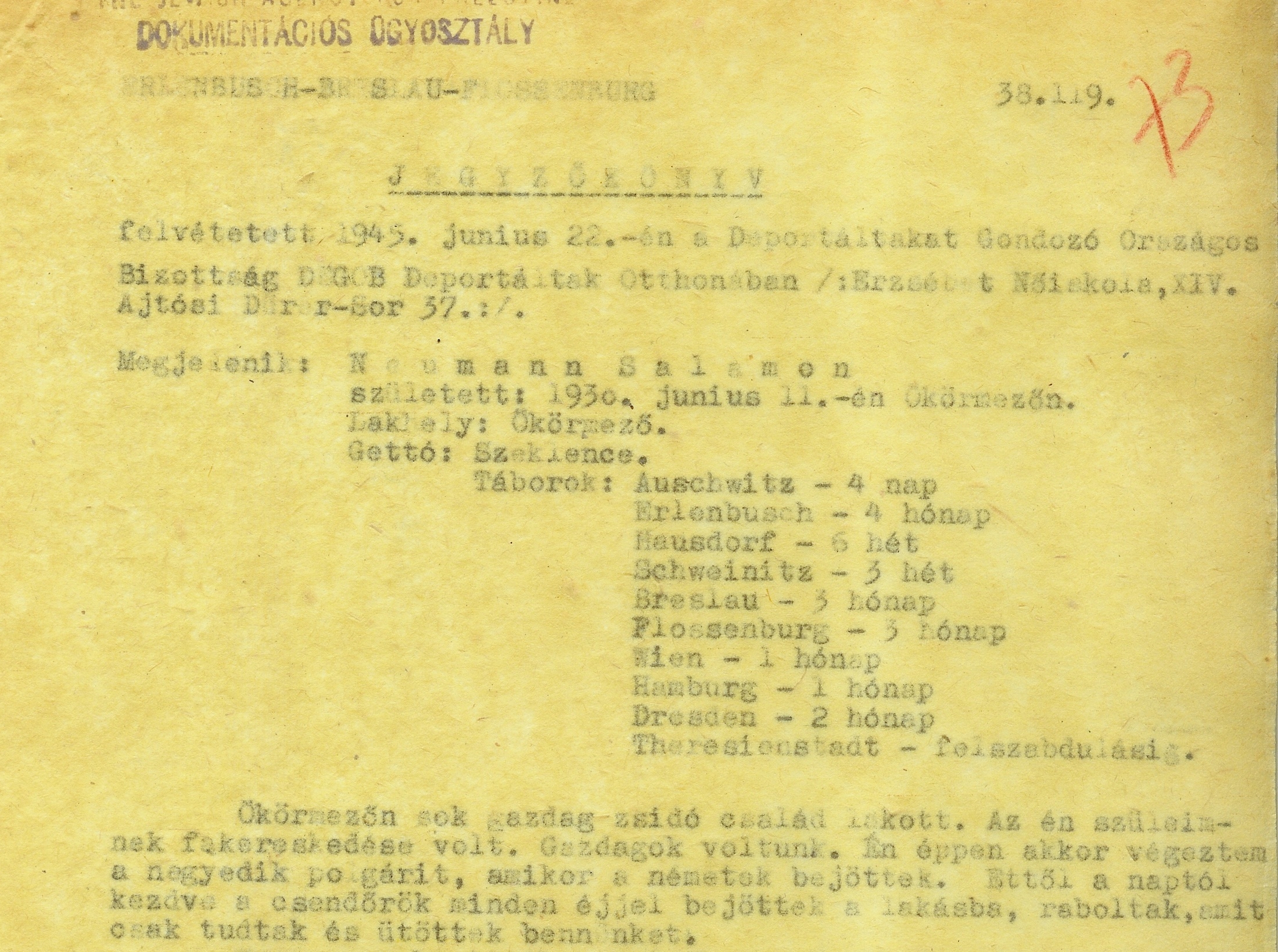 A megemlékezés és a kutatás metszéspontjában egy DEGOB jegyzőkönyvet szeretnék bemutatni, amelyben egy túlélő fiú, Neumann Salamon számol be arról amin keresztül ment.4 A beszámolóra a tanú Budapestre érkezése után került sor, amikor az átélt események még nagyon frissek voltak, hiszen a tanúvallomás dátuma: 1945. június 22. A fiú csak 14 éves volt amikor családjával együtt Auschwitzba deportálták.