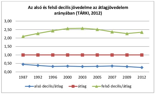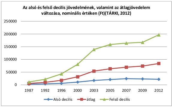 Forrás: TÁRKI, Társadalmi riport, 2012 (P10, P50 és P90 a decilisek „határpontjain” mért jövedelmeket jelzik)