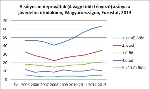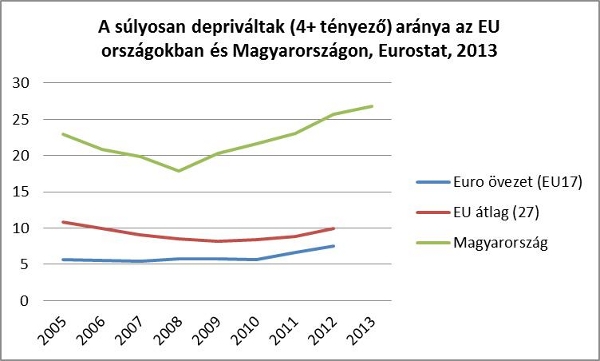 A táblázat azonban azt is mutatja, hogy a súlyosan depriváltaknak a lakosságon belüli aránya a válság kezdetéig gyorsabban csökkent, a válság kezdete óta lényegesen gyorsabban nőtt Magyarországon, mint az európai átlagok.