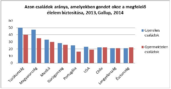 Ha az életkörülmények változását és romlását kevésbé komplikált adatokon akarjuk bemutatni, akkor érdemes a Gallup Intézet vizsgálati adatait felidéznünk arról, hogy az OECD tagországokban a családok mekkora hányadának okoz gondot a megfelelő étkezési színvonal biztosítása.5