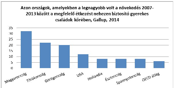 2007 és 2013 között Magyarországon volt megfigyelhető a legnagyobb arányú növekedés a megfelelő élelmezést nehezen biztosító gyerekes családok körében. Az önmagában is megdöbbentő adathoz két megjegyzést érdemes fűznünk. Egyrészt, szeretnénk azt hinni, hogy a megfelelő élelem biztosításának nehézségei a fejlődő országok, a harmadik világ problémája. Nem így van. Másrészt, az oly eleminek tekinthető létszükségletek, mint a megfelelő élelmezés nehézségei messze nem a nemzetközi összehasonlítások szerint 12-15% szegény problémája, hanem a gyerekes családok közel felének, a gyermektelen családok egyharmadának okoz gondot ez, és az arányok rohamosan, a fejlett világban a legnagyobb ütemben növekednek.