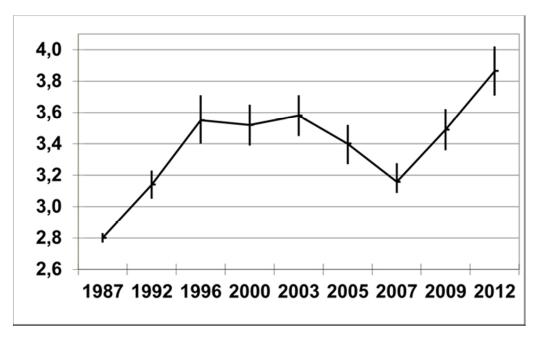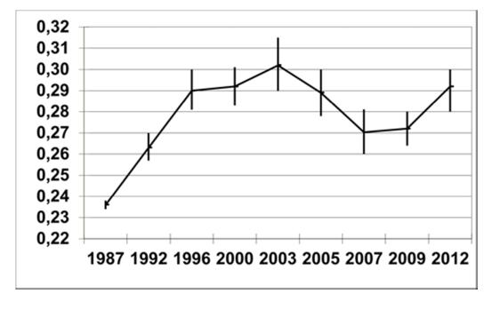 Gini-együttható változása (TÁRKI, Társadalmi Riport, 2012.)