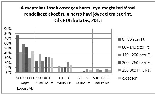 Ha a megtakarítások összegét is figyelembe vesszük, akkor azt tapasztaljuk, hogy a megtakarításokkal rendelkezők (tehát az aktív korú lakosság 16%-a) háromnegyede 1 millió Ft alatti megtakarítással rendelkezik, míg 3 millió Ft megtakarításnál nagyobb összeggel a bármilyen megtakarításokkal rendelkezők egytizede, a teljes megkérdezett lakosság kevesebb, mint 2%-a rendelkezik! (A Gfk 16-64 éves személyeket kérdezett meg, így azt nem tudhatjuk az eredményekből, hogy e megoszlások milyenek a háztartásokra vonatkoztatva. Tehát, elvileg ugyanígy „terülhetnek” a megtakarítások háztartások között is, de még szélsőségesebb lehet a megoszlás akkor, ha bizonyos háztartásokban kumulálódnak a megtakarítások azáltal, hogy a háztartás több tagjának is vannak félretett pénzei, és ekkor nyilvánvalóan még kisebb arányú lesz a megtakarításokkal nem rendelkező háztartások aránya.) Ha a 3 millió Ft megtakarítást olyan határvonalnak értjük, amelynél nagyobb megtakarításból „ki lehet húzni 1 évig, ha valaki munkanélkülivé válik és nem tud pénzt keresni”, akkor azt mondhatjuk, hogy a megtakarításokkal rendelkezők egytizedének, a teljes lakosság 2%-nak (100 aktív korú főből 2 embernek) nem kell különösebben szorongania attól, hogy munkahelye megszűnésekor miből fog megélni 1 évig. Ez az adat összecseng azzal, hogy a lakosság háromnegyede nem lenne képes kifizetni egy váratlan felmerülő kiadását.