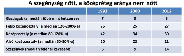Nézetem szerint a TÁRKI által adott cím nem egészen jól foglalja össze a táblázat tartalmát, ugyanis az adatok a szegénység növekedésével azonos súlyú átalakulásként jelzik a középréteg (később visszatérnék rá: én nem nevezném „középosztály” –nak) jelentős, 12%-pontnyi csökkenését.
