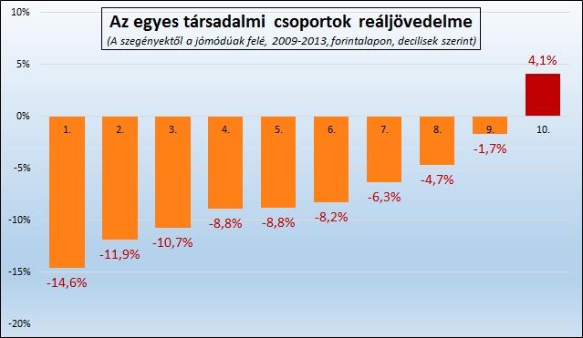 A grafikonokról jól leolvasható, hogy a legnagyobb jövedelmi veszteségek minden tekintetben a legalsó jövedelmi decilisben keletkeztek, ám az is jól látszik, hogy lényegében a társadalom túlnyomó többségének, 70-80%-ának romlottak a jövedelmi pozíciói az elmúlt években.