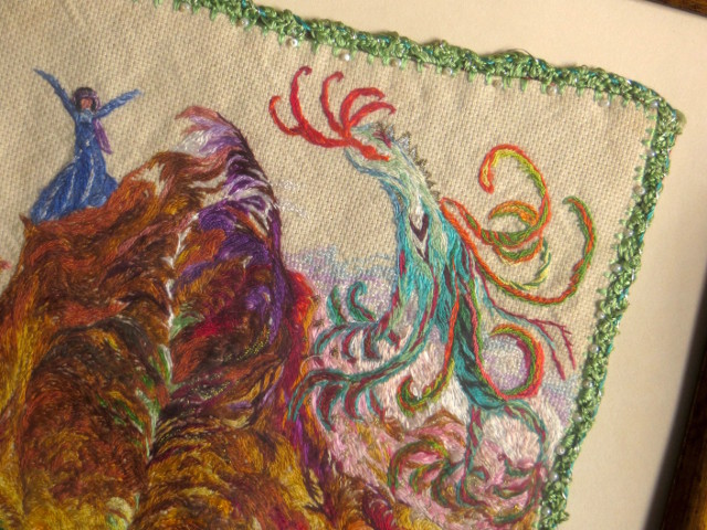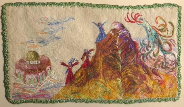A kép nagyon egyszerű. Az ismeretlen édesanya egész élete bele van hímezve. Egy gonosz (bár gyönyörű) sárkány fenyegetően lép föl a kép jobb oldalán, mondhatni, támadólag. Három asszony élete úgy látszik, komoly veszélyben forog – vagy ha nem, akkor tesznek róla, hogy veszélyben forogjon. Valamit valamitől meg kell védeni, viszont talán éppen azzal támasztjuk fel a veszélyt, hogy azt a valamit meg akarjuk védeni – azzal adunk életet neki, hogy el akarjuk pusztítani. Az asszonyok odadobják magukat, hogy intaktul megőrizzék azt az elérhetetlen világot, amelyet egy szinte minden jeruzsálemi képeslapon feltűnő templom személyesít meg. Kinek mit jelent ez a templom, nagy kérdés. És van még a szent hely fölött három felhőként úszó madár. Ők gondtalanul repülnek egyenesen a sárkány torkából kilövellő lángnyelvek felé. Ez idáig rendben is van. Ha odaérnek, megpörkölt szárnyakkal majd lezuhannak. Tökéletes mese. Ne legyen baj a világban. Haljunk bele, de ne legyen semmi baj.