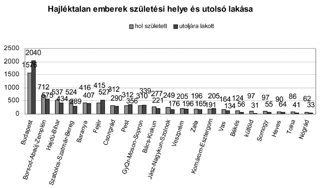 A kérdőíveinkkel elért hajléktalan emberek zöme Budapesten született, de még többen voltak azok, akiknek itt volt az utolsó lakásuk. Ez összecseng azzal a közismert településszociológiai tapasztalattal, amely szerint Budapest állandó migrációs célpont. A Budapesten élő emberek jelentős része minden korszakban vidéki (esetleg külföldi) születésű volt. A vidékről a városba vagy a fővárosba áramló tömegek pedig legtöbbször veszélyeztetettebb helyzetben voltak, mint a helyben születettek. Ezeknek az embereknek egy része már eleve vagy a vidéki munkanélküliség és a rossz megélhetési viszonyok elől menekült a fővárosba, vagy jobb perspektívákkal érkezett, de aztán valamiért mégsem tudott megkapaszkodni, és helyzete marginalizálódott. Végül – ha vidékre már nem volt visszaút – akár hajléktalanná is válhatott.