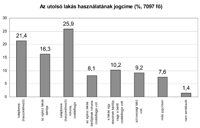Az utolsó lakás használatának jogcíme érdekes képet mutat. Mindössze a megkérdezettek 21,4%-a volt tulajdonosa annak a lakásnak, amelyben élt, azt pedig tudjuk jól, hogy a mai Magyarországon többnyire csak a tulajdon nyújt elfogadható lakhatási biztonságot. Az utoljára „egész lakást bérlők” csoportján belül (16,3%) sajnos nem ismerjük az önkormányzati, ha- tározatlan idejű („fő-”) bérletek és a piaci magánbérletek (amit a köznyelv ma „albérletnek” hív) arányát, pedig ez a lakhatási biztonság és a helyi társadalomba való beágyazottság mértékére való következtetés szempontjából rendkívül fontos lenne. A határozatlan idejű önkormányzati lakásbérleteket „biztos lakhatásnak” tekinthetnénk, hiszen viszonylag alacsony a lakbérük, és aránylag „nehéz” elveszíteni őket. A piaci lakásbérletekről ugyanez nem mondható el. Ezek jóval drágábbak, és a lakhatási jogbiztonság legtöbbször hiányzik mögülük.