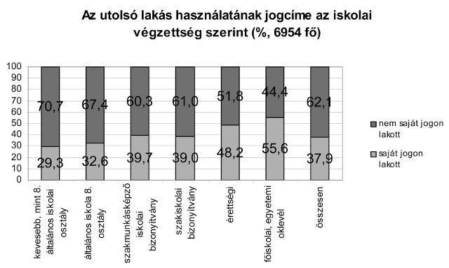 Az utolsó lakás jogcímére vonatkozóan csak a „saját jogon lakó” és a „nem saját jogon lakó” összevont csoportokat vizsgáljuk. A saját jogon lakók közé soroltuk azokat, akik az utolsó lakásukat „tulajdonosként” használták, és azokat, akik „egész lakást béreltek”. A többiek a nem saját jogon lakók közé tartoznak. A saját jogon lakók közé az összes kérdezett 37,9%-a került, míg 62,1%-ot tesznek ki a nem saját jogon lakók. A képet azonban erősen árnyalja, ha a különböző iskolai végzettségi csoportokban egyenként is megnézzük ugyanezt. Minél magasabb iskolai végzettség szerinti csoportot vizsgálunk meg, annál hangsúlyosabban vannak jelen az utolsó lakásukat saját jogukon lakók: azok között, akik az általános iskolát sem végezték el, arányuk csupán 29,3%, míg a diplomásoknak több mint a fele (55,6%) tartozik ide.
