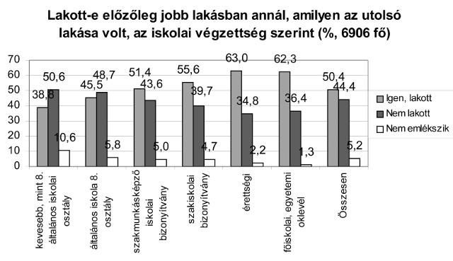 Hasonló tendencia figyelhető meg a „Lakott-e előzőleg jobb lakásban annál, mint amilyen az utolsó volt?” kérdésre adott válaszok esetében is: az iskolai végzettség növekedésével szintén egyenletesen emelkedik azok aránya, akik korábban már valamikor jobb lakásban is laktak.