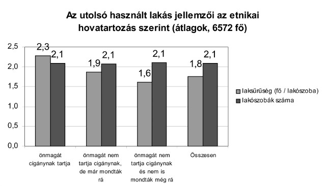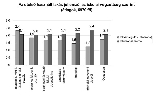 Az átlagos szobaszám nem mutat különösebb eltérést az egyes csoportokban, a zsúfoltság mértéke viszont igencsak függ az iskolai végzettségtől. Míg az általános iskolát sem végzettek között átlagosan 2,4 fő lakott egy szobát (ez az adott szobaszám /2,1/ mellett öt fő együtt élőt jelent), addig a diplomások utolsó lakásában csak 1,2 fő lakott együtt egy szobában (ami az adott szobaszám /2,4/ mellett átlagosan 2,9 fős háztartást jelent).