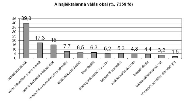 A válaszadók (az imént említett személyes okok mellett) úgy érzik, hogy azért váltak hajléktalanná, mert valamilyen intézményből kerültek ki (állami gondozásból jött 5,2%, börtönből szabadult 5,3%, vagy kórházból, szociális otthonból jött el 1,5%). Mások közvetlenül lakhatásuk elvesztéséhez kötik hajléktalanságukat: a válaszadók 15%-a nem tudta tovább fizetni a lakásbérleti/ albérleti díját, 7,7% számolt be arról, hogy a munkahelyével egybekötött lakhatás megszűnése miatt vált hajléktalanná, 6,5%-át kiüldözték lakásából, 6,3%-át kilakoltatták, 4,8% a lakásmaffia áldozatának érzi magát, és végül 3,2% lakása lakhatatlanná vált.