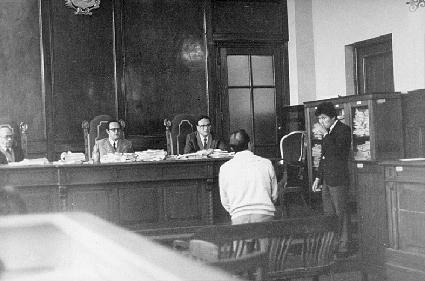 Titokban készült felvétel: terrorizmussal vádolt keresztény (háttal) a perui bíróság elõtt. Védõje (jobb szélen) a "Paz y Esperanza" (Nemzeti Protestáns Tanács) képviselõje. |