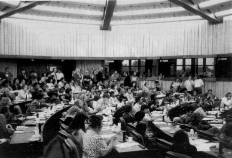 EUROPEAN PARLIAMENTNiels Hueck, Stuttgart, WestdeutschlandEuropean Parliament. This meant waiting, going through security checks, corridors, and more waiting in the conference hall. The Green Euro-MPs came, listened and responded. One of them challenged us by claiming that, if he were us, he would not leave the building until the Socialist and Christian Democrat parliamentarians had appeared as well. We the citizens of Europe were in charge here. Agreement was rapidly reached amid loud applause. The parliamentary groups were informed. The press was got in. Songs were sung. Our concerns were formulated once again. By the time we left it was four hours later than scheduled. This sit-in did not change the world but I was happy to have been part of this.