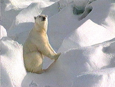 Az előbb láttuk a vízben azt a foltos jegesmedvét. Nem nehéz kitalálni, hogy szeméttől, vagy valamilyen zsiradéktól lett piszkos. Lehet, hogy ipari eredetű olajtól. Az is biztos, hogy nagyon sovány állat, az évnek ebben a részében sokkal kövérebbnek kellene lennie. Jobban fog kinézni, mikor nagyobb lesz a bundája, de most nagyon megérzi a hideget, és sok energiát veszít.