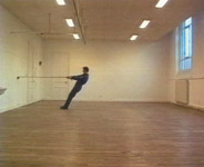 the space, holds onto the rope and stretches it, performing various