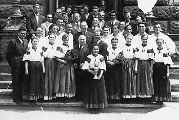 Rákosi Mátyás, mellette Falvay Károly (a fotó tulajdonosa) a Ruggyantagyár frissen megalakult tánccsoportjával a régi (1965-ben felrobbantott) Nemzeti Színház elôtt