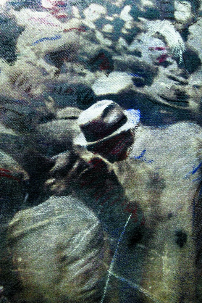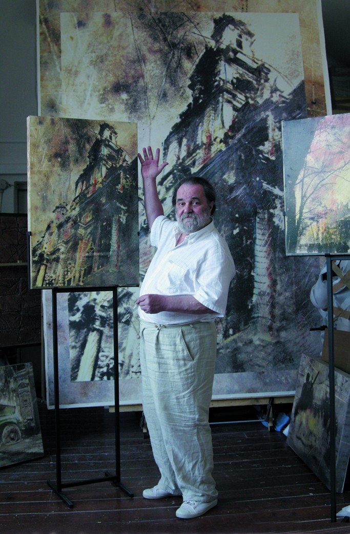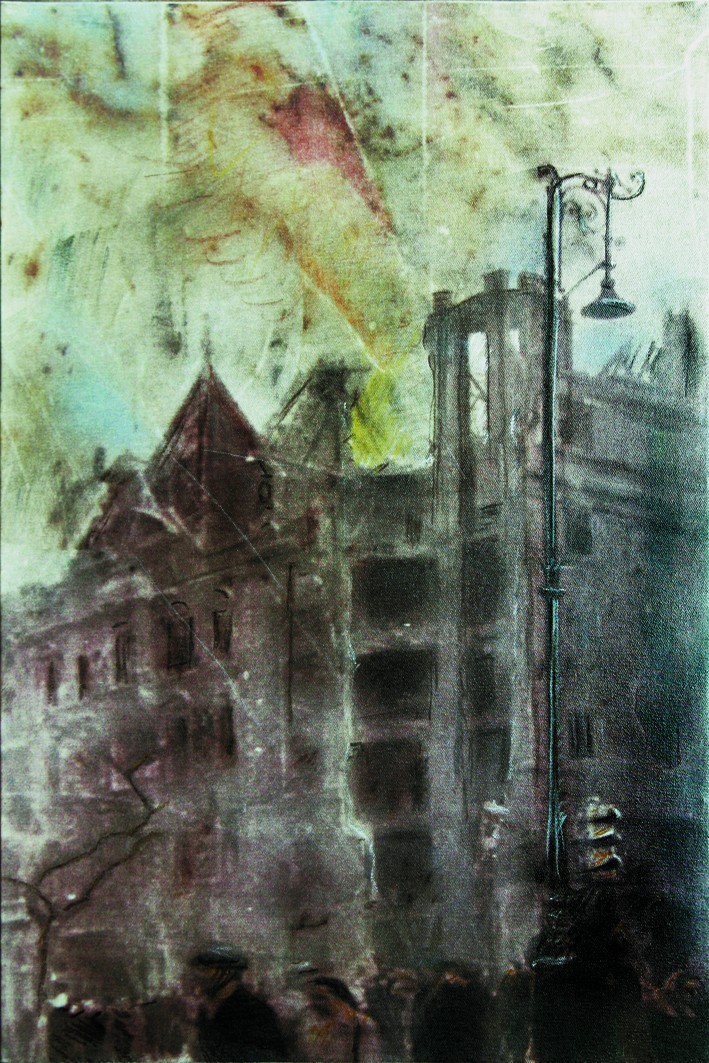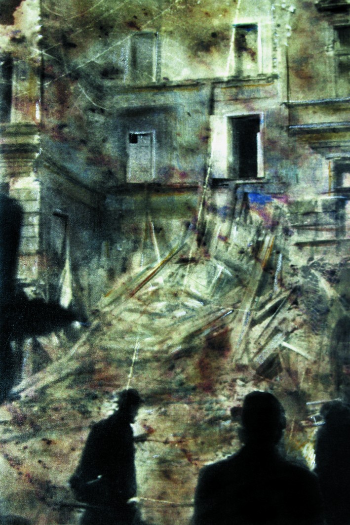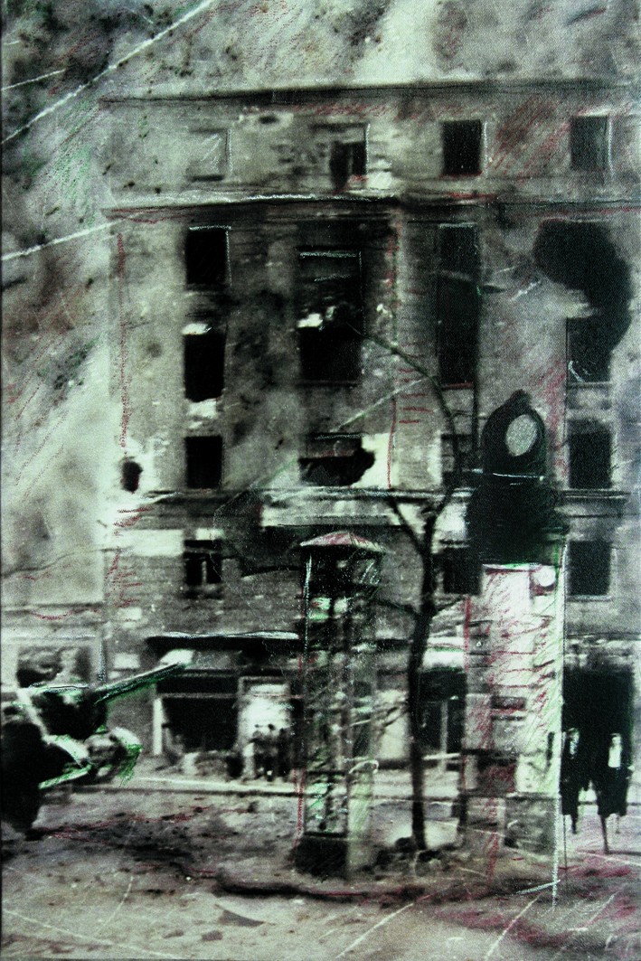Idősebb Gazsi Zoltán, ifjabb Gazsi Zoltán operatőr barátom édesapja 1956-ban az utcákat járta és fényképezett. Ugyanazokat a helyeket járta végig, amiket én, 15 évesen. Egy Leica fényképezőgéppel, ravasz módon készítette a felvételeket, felesége fedezte az exponálást. Ő később fehérneműs szekrényben rejtette el egy kis dobozkában a képeket. Ötven év után most kerültek elő, soha senki nem láthatta még őket. Igazán szíven talált, hogy ugyanazzal a látvánnyal találkoztam, ami nekem is személyes élményem volt. A sorozat több, mint 100 darabból áll. Ebből 15 képet választottam ki, melyre a köztéri műegyüttest építem. A Budapest szétlövetését ábrázoló képeket 2×3×0,2 m-es színes olajfestményekké nagyítottam, melyek pszeudo márványsztéléken jelennek meg.