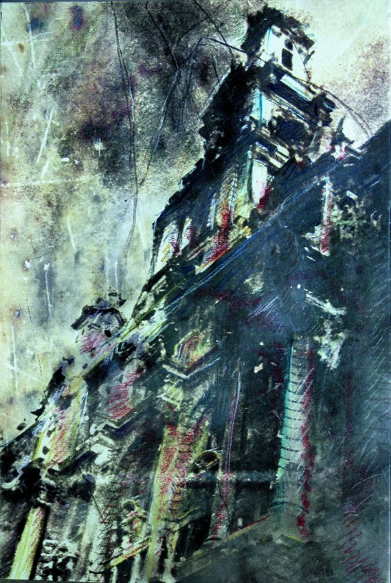 Megkíséreltem eljutni a mesteremhez is, Luigi de Battistához, Viola utcai műhelyébe. Az Üllői útig jutottam, és visszafordultam, mert hányinger kerülgetett a szanaszét heverő, bűzös, oszló, lánctalpakkal fasírttá trancsírozott hullák láttán. A szisztematikusan szétlőtt Üllői utat – a Lechner-palotát és az Örökimádás-templomot – látván megértettem, hogy teljesen elszabadult a pokol. A harcosok – jobbára ateisták, – kedvelték a kimagasló tornyokat, kitűnő célpontnak tűntek, látványos volt a leomlásuk. A felkelő forradalmárok is elveszítették a fejüket. Ellepték a még épen maradt háztetőket, onnan lövöldöztek.
