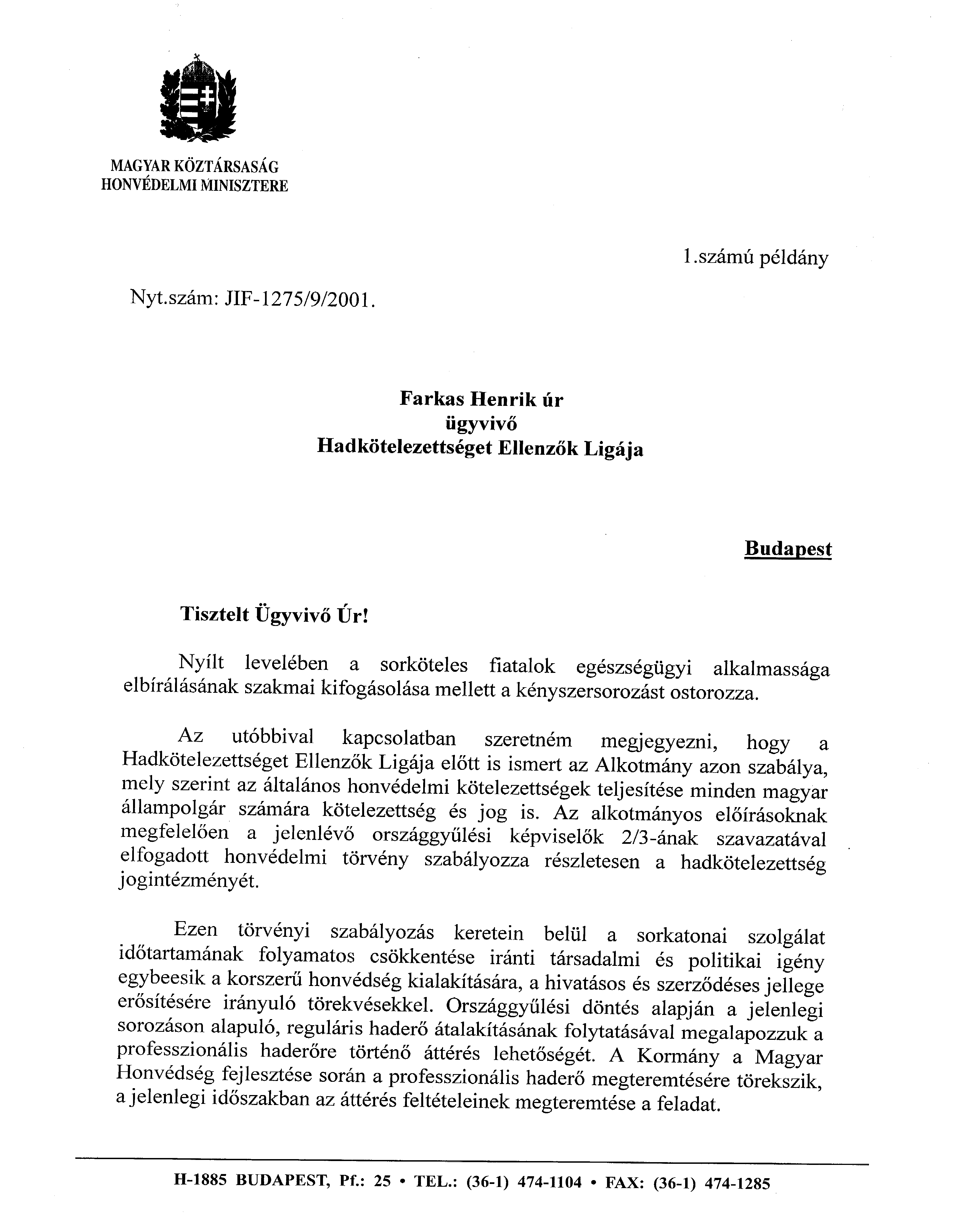 Tisztelettel kérjük Önöket, hogy a rendelettel kapcsolatos információkat - beleértve a szerződéses katonák alkalmassági szempontjait és a megfelelő statisztikai adatokat is - juttassák el hozzánk. A hadkötelezettség megszüntetésért küzdő HEL aggódó figyelemmel kíséri a sorkatonákkal kapcsolatos rendeleteket, intézkedéseket.