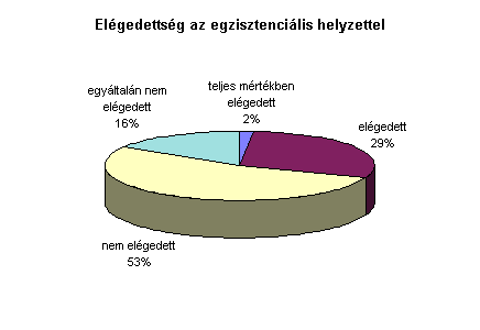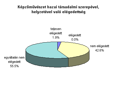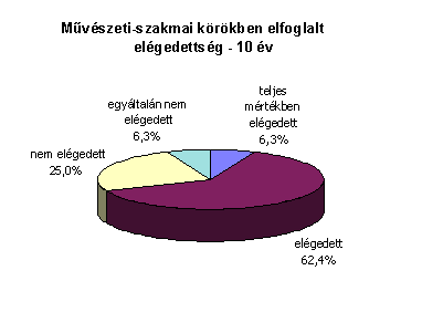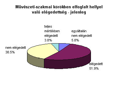 A fentiek ismeretében talán már nem tûnik meglepõnek az az eredmény, miszerint a válaszadók több mint a fele elégedett a szakmai-mûvészeti körökben elfoglalt saját helyével, és pozitív várakozásokkal tekint elkövetkezõ mûvészi pályafutására. Mûvészeti ágak szerint találunk némi különbséget a fiatal képzõmûvészek körében, hiszen a grafikusok negatívabban ítélik meg saját helyzetüket (57,9%-uk elégedetlen), az intermédiások viszont feltûnõen pozitívan vélekednek saját mûvészeti-szakmai "pozíciójukról" (72,3%-uk elégedett). Továbbá a férfiakat elégedettebbnek mondhatjuk, mint a nõket, életkor szerint azonban nem találtunk szignifikáns eltéréseket.