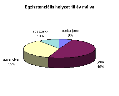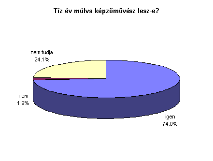 Az Egyesület tagjainak háromnegyede vélekedik úgy, hogy 10 év múlva is képzõmûvész lesz – a többiek még nem tudják, hogy vajon így lesz-e. Mindenestre viszonylag magasnak tûnhet a bizonytalanok aránya. Képzõmûvészeti ágak, illetve életkor szerint sem találtunk különbséget a válaszok megoszlásában. Az egyetlen eltérést a nemek között találtuk: a nõk valamivel bizonytalanabbnak tûntek jövõjüket illetõen.