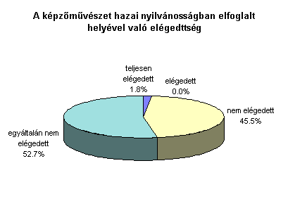 A fenti eredményekhez jól illeszkedik a képzõmûvészet – legszélesebb értelemben vett – hazai nyilvánosságban elfoglalt helyével való elégedetlenség is. Az immár négyfokú skálán mért vélemények alapján egyértelmûen elmondható, hogy a fiatal képzõmûvészek rendkívül rossznak tartják a szakma nyilvánossághoz jutási lehetõségeit. Ezen belül is különösen a szobrászok vélekednek nagyon negatívan, és a nõk is kritikusabbnak tartják a helyzetet.