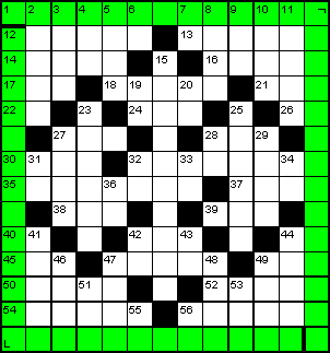 Vízszintes: 1. (zárt betűk: S,L,K,B,L,D). 12. Gyorsan beszélő, 13. Olimpiai bajnok úszó, 14. A csörtéző, 16. Magyar Távközlési Vállalat 17. Régi mértékegység, 18. Vas megyei település, 21. Országos Rendező Iroda, 22. Folyó tetőzése, 24. Díszes egyházi épület, 26. Zamat, 27. Becézett Aladár, 28. Menyasszony, 30. Tüzet fékező, 32. Hófehérke és a ..., 35. Fémmel foltozva, 37. Német író (Thomas), 38. A hazai tudomány fellegvára, 39. Vízpára, 40. ÜP, 42.
