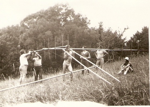 Készül a csoport-antenna 2 méterre... A délután a sátrak felállításával, az antennák elhelyezésével és az állomások üzembe helyezésével telt el. Antennaparkunk a következőkből állt: W3DZZ 80 és 15 méterre, 40-20-10 méterre egy-egy HB9CV beam. Az adóvevők: Telrád 200 és FT 250. Eredetileg úgy terveztük, hogy mindkét berendezés állandóan dolgozni fog, különböző sávokon. Sajnos a szállításnál az FT tápegységében letört egy hibás forrasztás, mivel így negatív rácselőfeszültség nélkül maradtak a végcsövek, az első bekapcsolás után - néhány másodperc alatt - felizzottak és begázosodtak. A végeredmény az lett, hogy SSB-n egyáltalán nem, CW-n 40-50 W inputtal lehetett használni az adóvevőt. Az első hétvége a Duna-kanyar versennyel telt el, különösebb nagy eredmény nélkül. Mivel harmadízben vettünk rajta részt, mint 10 pontos állomás ( HAØKHW/7 ), nyugodtan mondhatom, sokkal kisebb volt az aktivitás, mint az előző években. Hétfőn ( július 31-én ) délután figyeltünk fel először a 10 m-es sávban tapasztalható jó terjedésre. Antennánkat DNY-ra fordítva 599-cel hallottunk néhány dél-amerikai állomást. Sikerült a QSO több brazil és argentin állomással. Mivel a kapott riportok lényegesen gyengébbek voltak, mint amit mi adtunk, elhatároztuk: az antennát magasabbra emeljük. Közben besötétedett, így ez a munka másnapra maradt. Reggel tervrajzok nélkül is elkészült az új, fa antennaárboc. A talpcsapágy szintén faágyból készült - klubtitkárunk János OB elképzelése szerint -, az egész árboc forgathatóságát biztosító kikötés 2 db konzerves doboz felhasználásával lett megoldva. Az eredeti 4 m-ről kb. 10 m magasságba került a 28 MHz-es HB9CV antenna. Eleinte két emberre volt szükség a körbeforgatáshoz, később - bejáratás után HI - már egy antennaforgató op. is elég volt. HI! Az első állóhullámarány mérések arról tanúskodtak, hogy igencsak felcsúszott a rezonancia-frekvencia, így árbocdöntés, majd az antennaelemek meghosszabbítása következett. Újabb mérések után kiderült: túl sokat toldottunk. Gyors számítások, újabb árbocdöntés, most elemrövidítés és az eredmény: a távíró sávban 1:1.2-nél sehol sem rosszabb az állóhullámarány. Igaz, ekkorra már dél lett, a reggel tapasztalt keleti DX terjedésnek nyoma sem volt. Csak UA3/RA3 és UB5/RB5-ös állomásokkal tudtunk forgalmazni, viszont a kapott riportok meggyőztek minket arról, hogy jó munkát végeztünk. Elhatároztuk, hogy az egyik adóvevőt állandóan 28 MHz-en fogjuk üzemeltetni, fél-, egyóránként váltott operátorokkal, így mindhárom kitelepült hívójelnek ( 'ØKHW/7, 'ØKHP/7, 'ØHP/7) lehetősége lesz kihasználni az esetleges jó terjedést.