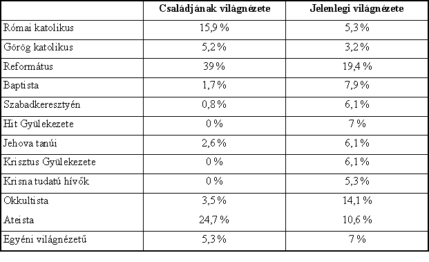 Tehát a római katolikus, a görög katolikus és a református egyházak veszítették el a legtöbb hívõt. Ennek okát abban látjuk, hogy sok új egyház alakult, amelyek vonzóbbak az emberek számára (pl. a rockzene miatt), és ezek az egyházak célúknak tekintik azt, hogy terjesszék a tanításaikat, míg a katolikusok és a reformátusok - ismereteink szerint - nem foglalkoznak ezzel a kérdéssel. Emiatt nõtt olyan nagy mértékben a baptisták, szabadkeresztyének és Jehova tanúinak száma. S szintén ez az oka annak, hogy a Hit gyülekezetének, a Krisztus gyülekezetének és a Krisna tudatú hívõknek a tanai ilyen gyorsan elterjedtek (holott õk még nincsenek olyan régen jelen hazánkban, hogy bárki is ilyen szemléletû családban nõhetett volna fel.). Kutatásunk szerint az ateisták létszáma több mint felével csökkent, ez azért alakulhatott így, mert a megkérdezett újkeresztények és okkultisták nagy része ateista családban nõtt fel. A 7. kérdésben arra voltunk kíváncsiak, hogy az emberek hogyan kerültek kapcsoltba jelenlegi világnézetükkel. Erre a kérdésre a következõ válaszokat kaptuk: Családjától örökölte: