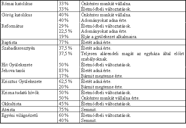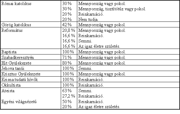 A történelmi egyházaknál megint azt figyelhetjük meg, hogy a hívõk mennyire tájékozatlanok saját vallásuk tanításait illetõen. Elképesztõ, hogy a római katolikusok 20 %-a nem tudja, hogy mi van a halál után és csak a 30 %-uk jelölte meg az õ hitüknek megfelelõ választ, "a mennyország, tisztítótûz vagy pokol"-t. Nagyon meglepett minket, hogy a reformátusoknál alig maradt le az utolsó három válasz (mindössze 1 személy döntésén múlott) a "mennyország vagy pokol" lehetõségtõl. Valószínûnek tartjuk, hogy ezek az emberek csak a megkereszteltségük miatt érzik úgy, hogy ezekhez az egyházakhoz tartoznak. Az újkeresztények és a baptisták viszont többnyire egyetértenek abban, hogy a halál után a mennyország vagy a pokol van. A Jehova tanúi itt is teljesen más véleményen vannak, mint a többi újkeresztény egyház. Nem számítottunk arra, hogy sok ateista hisz a reinkarnációban. Bizonyára úgy gondolják, hogy Isten nem létezése nem zárja ki az újjászületést. A 18. kérdés arra keresi a választ, hogy mi a legnagyobb áldozat, amit az emberek megtennének vallásukért / hitükért / világnézetükért / Istenükért: Semmit: 16 %