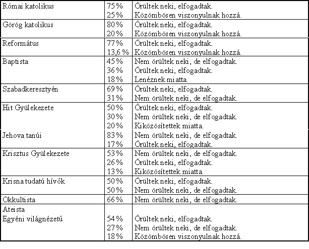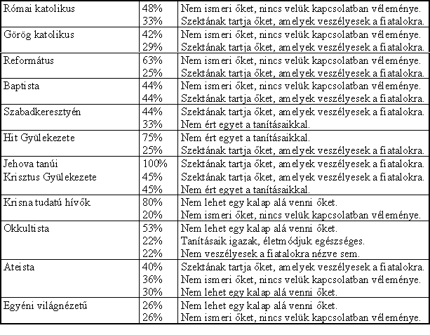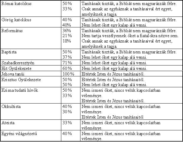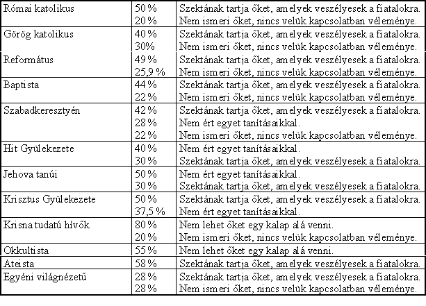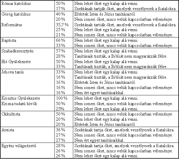 Ezek az adatok igazolták azt a feltevésünket, hogy az újkeresztény egyházakat még kevesebben ismerik, mint a történelmi egyházakat. Talán emiatt van az, hogy nagyon sokan "veszélyes szektának" tartják õket. A megkérdezettek legnagyobb része szerint nem lehet õket egy kalap alá venni. A különbözõ hitû emberek véleményei