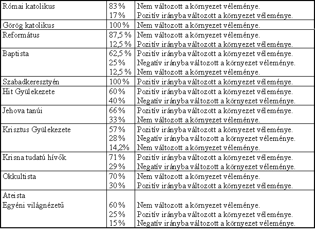 A katolikusok és reformátusok nem élnek olyan aktív hitéletet - mint az a korábbi kérdésekbõl is kiderült - s ezért nem lehet észrevenni beszédükön, magatartásukon, hogy különböznének másoktól. Talán ezért közömbösek az õ hitük iránt az emberek, a családjuk pedig természetesen örül, ha egy fiatal konfirmál, vagy elsõáldozó lesz. Nagyon szembetûnõ az az eredmény, hogy a Jehova tanúit fogadják el legkevésbé az emberek. Az ateistákhoz, azért nem írtunk semmilyen adatot, mert szerintünk õket nem kell elfogadniuk a többieknek, hiszen õk alkotják a többséget, tehát inkább õk fogadnak vagy nem fogadnak el másokat. A 23. kérdéssel azt akartuk kideríteni, hogy hogyan változik a környezet véleménye a hívõ emberekrõl: Nem változott a véleményük: 49 %