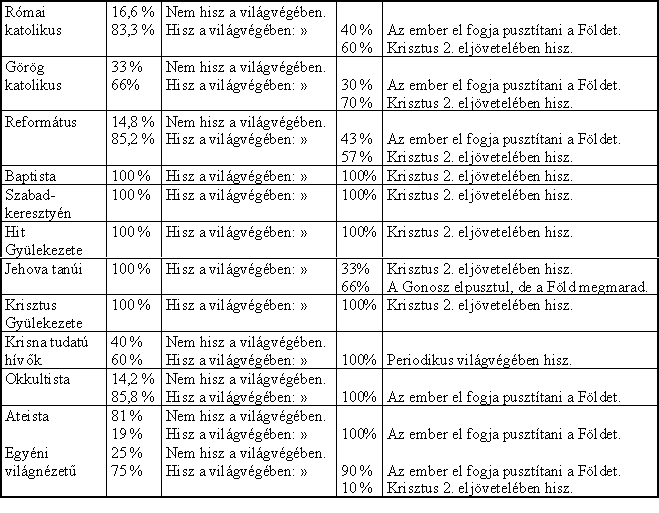 "Jelenleg a Kali-korban élünk, amely egy degradált kor, s még 42700 évig tart. Ennek vége azonban nem a világvége. Hanem az univerzum vége azonban nagyon sok idõ múlva lesz." (egy Krisna-tudatú hívõ véleménye) "Bizonyos idõ után az anyagi világ elpusztul, megnyilvánulatlan állapotba kerül, majd újrateremtõdik, megnyilvánul." (egy Krisna-tudatú hívõ véleménye) "Az emberi butaság és önzés határtalan, az emberiség elõbb-utóbb elpusztítja saját életlehetõségeit." (egy ateista véleménye) "Nem hiszek a világvégében, mert ha az ember kárt is tesz a világban, manapság olyan technika van az emberek birtokában, hogy biztosan korrigálják a hibát." (egy egyéni világnézetû véleménye) "Az ember képtelen együtt élni a természettel, kihasználja, ezért a természet elõbb-utóbb visszavág (kimerülnek az édesvíz stb. források, elfogy az oxigén), ha az emberek el nem pusztítják egymást atom- vagy vegyifegyverekkel." (egy egyéni világnézetû véleménye) "Azt hisszük, hogy a természet törvényeit meg tudjuk változtatni. Természet nem tûr maga fölött semmit, így nem hogy megváltoztatni nem tudjuk, de nem is ismerjük." (egy egyéni világnézetû véleménye) A 16. kérdés az emberek istenképét tárja fel: Nem hisz semmilyen istenben: 11%