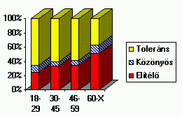 | Életkor | Elítélõ (%) | Közönyös (%) | Toleráns (%) |