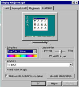 A legkényelmesebb képenyõ beállítást az alábbi ábrán is szemléltettük Windows95 alatt. A kívánt beálítást a Start menü Beállítások pontjában a Vezérlõpult csoportban lehet elvégezni.