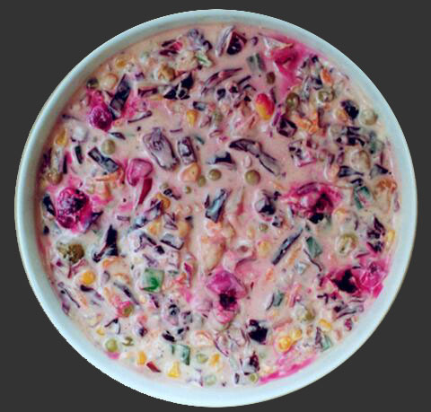 red cabbage, peas, red beet, corn, red onion, potato, green leek,