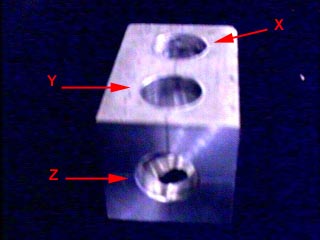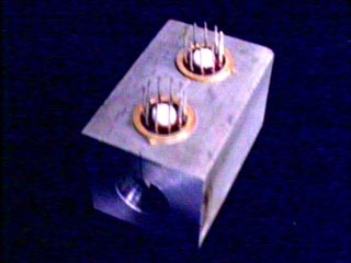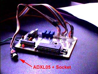 | 加速度計をマウントするための金具です. | このように加速度計を逆さまに取り付けます.モデム・ユニットのトランスミッタから伸びているケーブルの先にソケットが付いています.この図ではY軸用の加速度計が付いていません. |