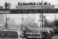 Reméljük, hogy sok hasznos információt sikerült nekik átadnunk, többek között egy szerepjáték és egy utcai figyelemfelkeltõ megmozdulás megszervezésével. A játékban mindenki kapott egy szerepet, amihez szigorúan tartania kellett magát, hogy a végén egy útszélesítést megvitató közmeghallgatás eljátszásával ismertethessük meg egymást, és „gazdagodhassunk" a hivatalos szervek által használt érvekkel. Gyakorlati példaként pedig megszerveztük egy transzparens kifüggesztését az M1/M7 autópálya Budapestre bevezetõ szakasza fölé, melyre az alábbi szöveget írtuk: „Az autózás káros az egészségre". Mindenki örömére megmozdulásunkról másnap a két legnagyobb országos napilap fényképes beszámolót is közölt. A személyes kapcsolatok kialakítását elõsegítõ esti szeánszok mellet természetesen a szeminárium részét képezte a budapesti helyi problémák szemléltetése is, minek kapcsán sor került szabálytalanul parkoló autókon való átkelésre, ami nem kis felháborodást keltett a tulajdonosok, illetve a szemközti irodaház biztonsági õrei között. Mint kiderült, a Fényes Elek utcában éppen az Autópálya Igazgatóság alkalmazottainak szabálytalanul parkoló gépkocsijai voltak utunkban.