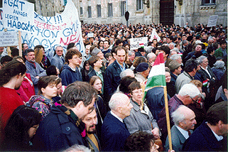 A civil szervezetek által szervezett 1998. február 28-i tüntetésen mintegy negyvenezren tiltakoztak a kormány értelmetlen Duna-politikája ellen. A tüntetõk kiáltványát és a Duna-mozgalom tárgyalásos egyeztetési törekvéseit teljes támogatásáról biztosította a környezetvédõ szervezetek egy héttel késõbbi országos találkozója. A tárgyalástól a kormány továbbra is elzárkózik.