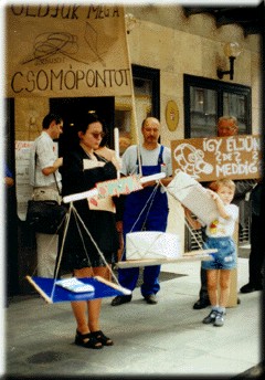 Ezt akartuk ismételten a közlekedési miniszter tudomására hozni demonstrációnkkal. Ennek érdekében egy rövid utca-színházi „előadással" léptünk fel, jó néhány transzparenst készítettünk, és a beszédeket követően kis ajándék kíséretében átadtuk petíciónkat a minisztert képviselő politikai államtitkárnak. Nos, Katona Kálmán válaszát azóta is várjuk...