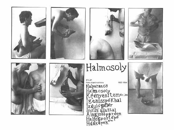 Hal, hal, hal, halséták. Üde mosolypárnák alatt, nem vagyok benned se, négyágú csillag. Egy picike révület gyermek-tartó fénye, felbontott arcok halas szívessége. Úgy igazán mezőmosoly-farok, minden szigonyisten halsága ablakvándor. Rádhullik a széphal. A nyakkendős tavasz, mocsárolvadás. És kopasz mosolyhalak, alkonyenergia, kiásott földmosoly. Ritmikusan gondolsz, én belédúszó vagyok: ünnep és hidegség. Szobahal nyávog, gyorsütemű lángok, vészjelző mosolyhálók.Itt a halak kufárok. Prémmosoly sodródás, óriási idő. Lengő hastánc, borbélyhalak a beretva élén, mosolyráncok tava és kúszó négyszemélyes lélekárny. Árny? Árnymozdulat? Talány. Halmágia. Beleharapok a húsba, szétduzzadó lyukhal asztali mosolya.