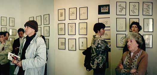 Szóval az, hogy újabban vonalrajzok lettek, az gondolom, egy fázis. Ahogy mondtam neked, hogy a Lovak elmaradtak, most arcok jöttek, aztán az is elmaradt. Most vannak a Sírkövek, azzal zárunk körülbelül, de most az is befejeződött, mert a saját - úgynevezett - műveim összefirkálása a legújabb. Na és arra mondom, hogy egy darabban vagyok, holott ez - gondold meg - egy széthulltság, hogy miről szól az az egy darab? Tehát nem az, hogy egy darabban vagyok, hogy egy homogén valami - mit tudom én -, amit próbál alkotni az az izé, amit én csinálok, az addig jól van. Meg, hogy nem vagyok olyan nagyon magam, pláne mostanság, meg minden, egy darabban vagyok. De amiket már gondolok, ha azt valaki komolyan veszi, akkor az van például, hogy fölfedeztem egy saját írásomat az Árgusban. Januári szám és egy írás, amit én tudok olvasni. Olyan, hogy saját magamtól. Mert többnyire az ember saját magától nem. Mert Jézus Mária! Egyszer a Németh Gabival beszéltünk. Kérdezte: te tudod önmagadat olvasni? S akkor a Gabi mondta: jaj, de meg van könnyebbülve, hogy én se. Most nem a Gabira akarom mondani, hogy ő se, de mondom, legtöbbször nem bírjuk önmagunkat olvasni. És akkor biztos más is így van ezzel - egy nagy közhely - és akkor ezt az Argust én olvasom, s mondom a feleségemnek, meg másoknak is, hogy te, van itt egy szöveg! Ki is tettem az előszobába, hogyha megyek majd és kiülök a kutyához vagy bármi és majd ott olvasom. És magamnak, hangosan. És rövid mondatok voltak. Egyrészt én is megértem, másrészt egész érdekes, na ilyet még nem írtam. És ez egy napig ment így! Harmadik nap kérdezem a feleségemet, hol az Argus, mert akartam fénymásoltatni. Fogalmam se volt hol van. Azt mondja nem vitted te ki az előszobába olvasgatni? Jaj, tényleg! De már két nap eltelt, rég el is felejtettem, s arra gondoltam: nem, hát én nem, én nem bírom magamat olvasni, dehogy olvasom el ezt az írást. S akkor valakinek ezt elmondod, ez a work in progress végülis, meg ez a folyamatosság is. Tehát egy-egy rajzból, mondjuk azért van talán több is, mert ment egy darabig az ügy és akkor másféle rajz jött.