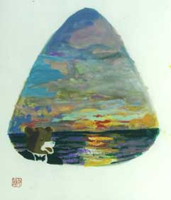 - Igen, bizonyos képeim pontosan követik a tusfestészet egyik irányzatát, a hokugát, ami magyarul annyit jelent: északi kép. A Mackósajt régebbi dobozán ugyanúgy megjelenik a végtelen, mint a zen festészetben: egy mackó tálcán tart egy sajtosdobozt, amelynek a fedelén egy mackó tart egy sajtosdobozt... Tehát a téma megfelelő. Lehet, hogy a tradíció ortodox tisztelői ezt szemtelenségnek érzik majd, ugyanakkor szerintem mégis tökéletesen illik a hagyományba, éppen a blaszfémia miatt. A zen ugyanis könnyedségre törekszik, a zen szerzetesek a saját dogmáikat is kiröhögik. Láttam tájképet, amelyen a kompozíció bizonyos pontjára, a meditáló szerzetes helyébe egy békát festettek, és jelezték, hogy ő már Buddha, mert kellően régóta meditál.